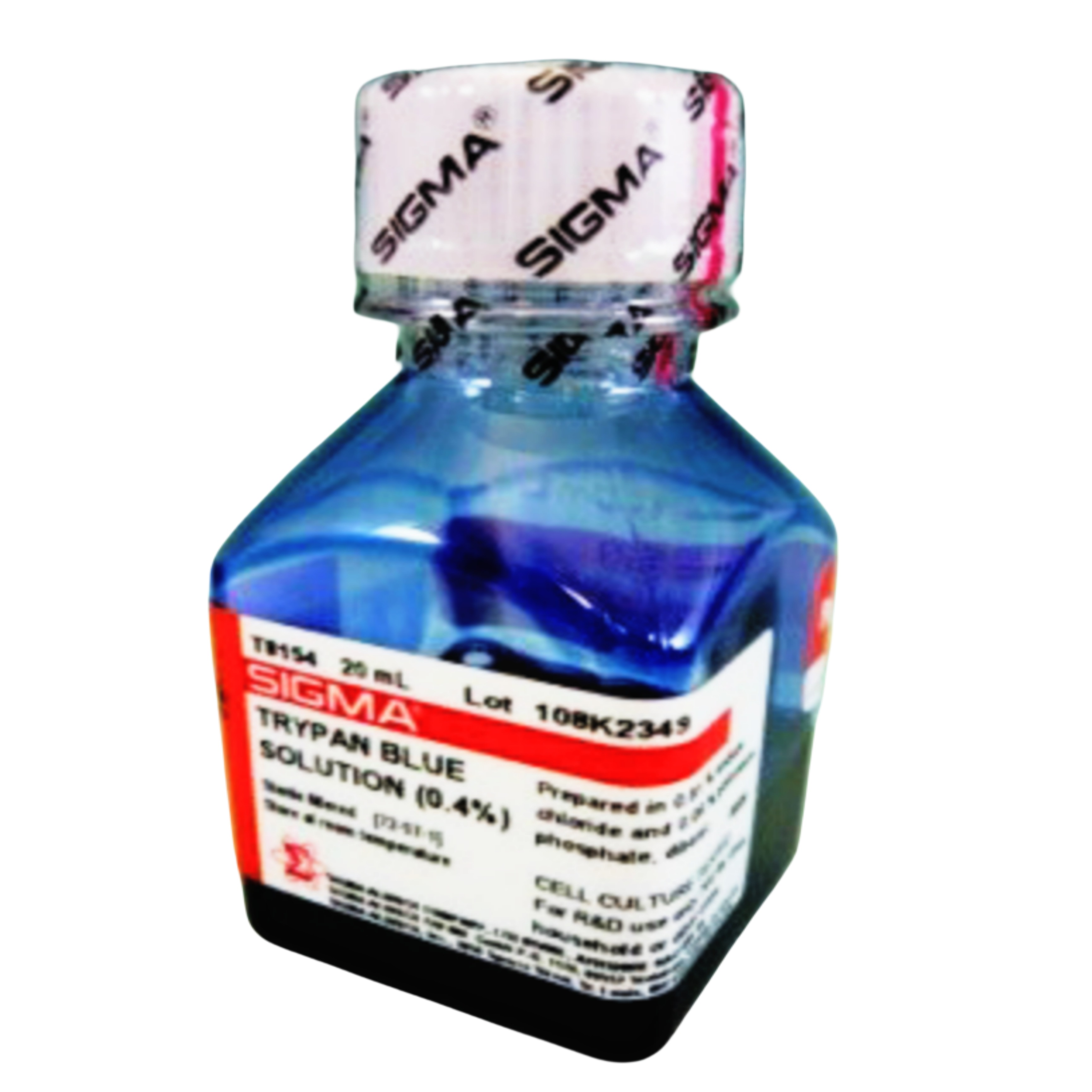 Trypan Blue solution با کد T8154 از کمپانی Sigma-Aldrich یک رنگ آبی زیستی (vital dye) است که بهطور گسترده در آزمایشگاههای کشت سلولی و تحقیقات زیستشناسی برای ارزیابی زنده یا مرده بودن سلولها (Cell Viability Assay) استفاده میشود.