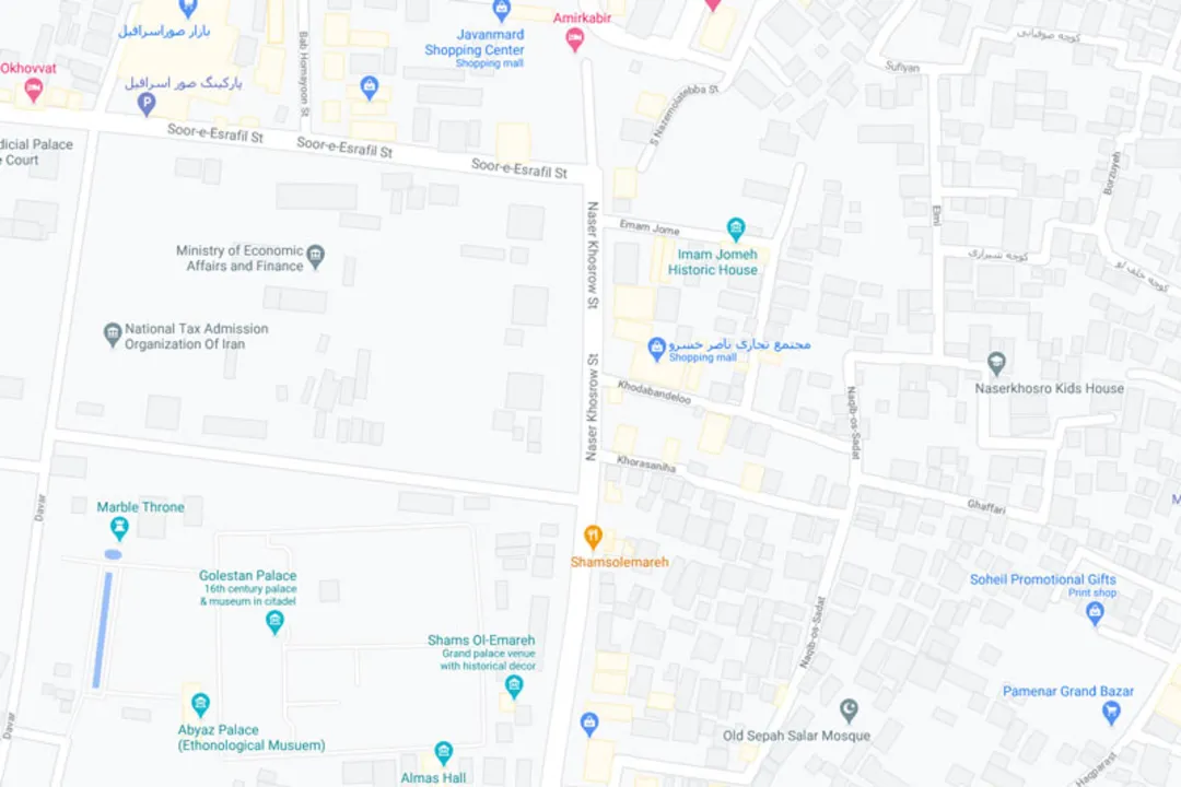 نشانی : خیابان ناصرخسرو از شمال به میدان امام خمینی (توپخانه) و از جنوب به خیابان پانزده خرداد محدود میشود.
